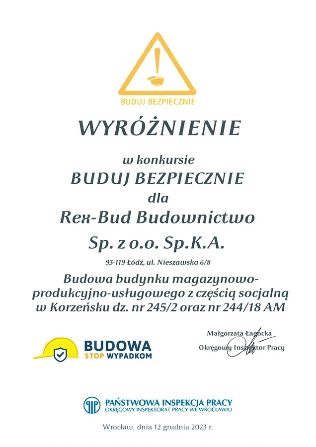 W ostatnich dniach zostaliśmy wyróżnieni w konkursie ,,Buduj bezpiecznie,, organizowanym przez Państwową Inspekcję Pracy we Wrocławiu za budowę budynku magazynowo-produkcyjno-usługowego z częścią socjalną w Korzeńsku!