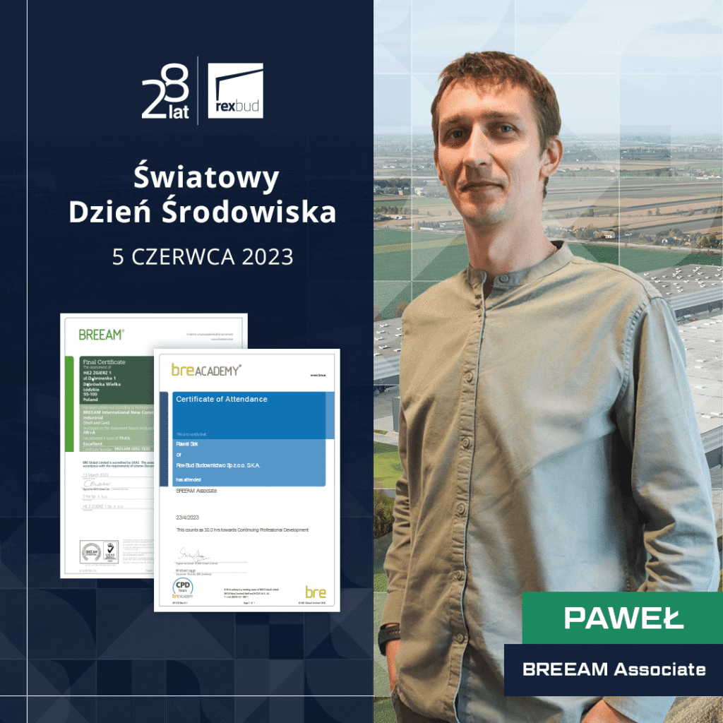 Czy wiecie, że dzisiaj obchodzimy światowy Dzień Środowiska? 🌱 W firmie Rex-Bud Budownictwo aspekty ekologii są dla nas niezwykle ważne, dlatego w naszym zespole mamy jednego z najlepszych specjalistów do spraw BREEAM. Poznajcie Pawła który codziennie dba, aby nasze najnowsze realizacje były na najwyższym poziomie! A to wszystko z uwzględnieniem dbałości o środowisko. Paweł jest uznanym inżynierem i certyfikowanym członkiem BREEAM Associate. Swoją wiedzę zdobywał na Bre Academy 🧑🎓Jego dzień jest naprawdę pracowity! Bowiem do jego zadań należy między innymi wewnętrzna kontrola procesu certyfikacji, doradztwo w zakresie realizacji zadań oraz weryfikacja zebranych materiałów dowodowych przed przekazaniem do raportu końcowego. W firmie Rex-Bud Budownictwo została wydzielona odpowiednia jednostka organizacyjna, która skupia się na aspekcie ekologii 🌱 Nasz zespół wdraża i uzgadnia szereg wytycznych pro-środowiskowych na inwestycjach takich jak np. ocena wartości ekologicznych terenu inwestycji, ochrona wartości ekologicznych oraz wdrażanie rozwiązań mających na celu poprawę bioróżnorodności, dostosowaną do warunków klimatycznych. . Posiadamy również certyfikat zarządzania środowiskowego ISO14001 (EMS).