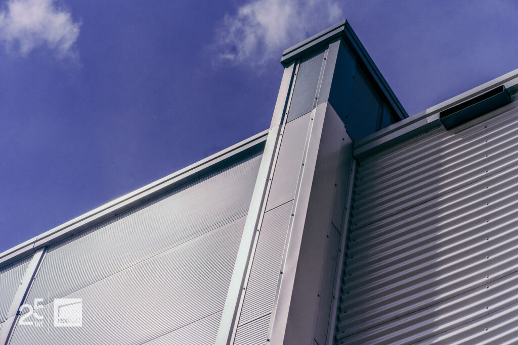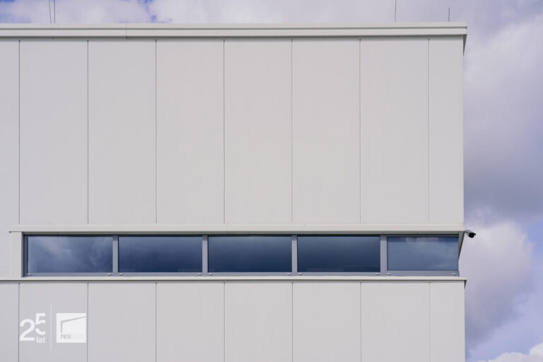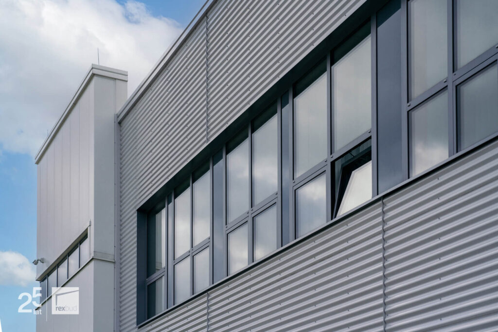 Budynek socjalno-biurowy został wykończony przy użyciu elewacji z blachy falistej, co nadało mu nowoczesny, industrialny wygląd.